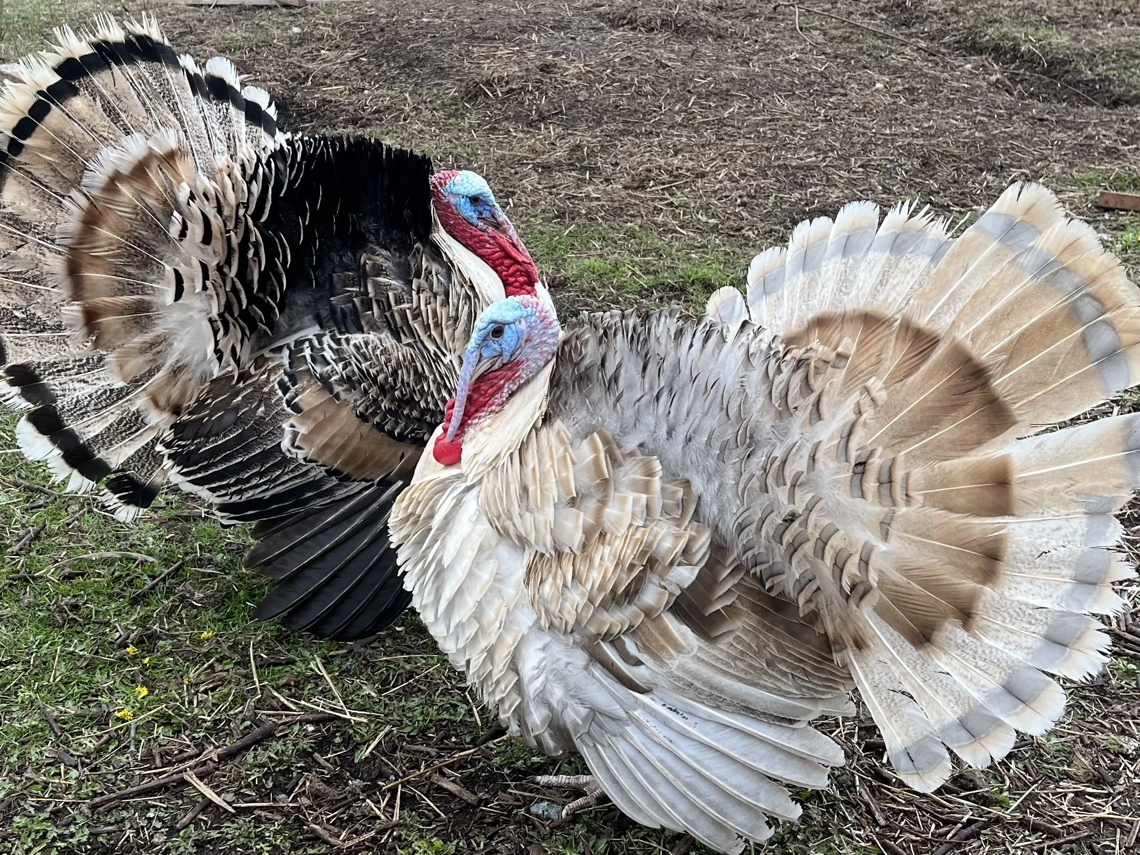 Our turkeys come from high-quality, home-bred stock with good temperaments. Those that are not sold shortly after hatch are regularly exposed to other birds, people, and dogs to make them friendly, confident, well-socialized birds.